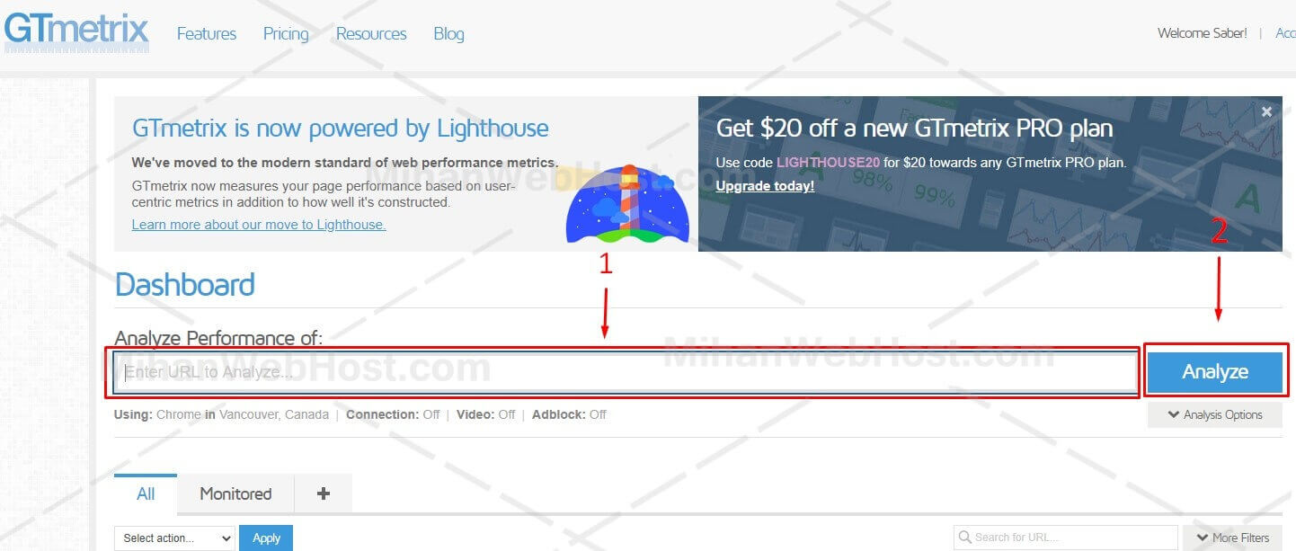 اولین گام در کار با این ابزار قرار دادن یک URL برای تجزیه و تحلیل می باشد. در وسط صفحه، شما با یک جعبه جستجو مواجه می شوید. آدرس URL خود را برای آنالیز وارد کنید (شماره۱). شما باید URL یک وب سایت را وارد کرده و با کلیک روی گزینه “Analyze” (شماره۲) مراحل بررسی سایت شروع می شود.