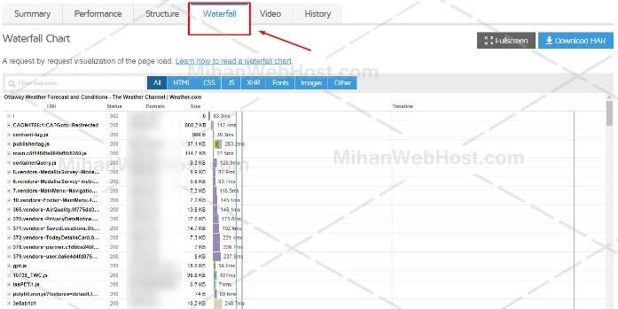 برگه “Waterfall” مربوط به نحوه بارگیری محتوا در سایت شما می باشد. در این برگه می توانید تمامی درخواست ها را به صورت دقیق مشاهده کنید. هر اسکریپت، پرونده چندرسانه ای یا لینک های خارجی که در صفحه سایت شما درخواستی ارسال می کند در اینجا نمایش داده می شود.