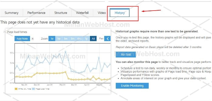 همانطور که از نام آن مشخص است، این تب مجموعه ای از اطلاعات مربوط به سرعت بارگذاری سایت، تعداد درخواست ها، نمرات مربوط به یک از معیارهای ذکر شده و موارد مشابه را در یک بازه زمانی نمایش می دهد. اگر حساب کاربری نیز در GTMetrix نداشته باشید، تا ۳۰ روز به تاریخچه سایت دسترسی خواهید داشت.