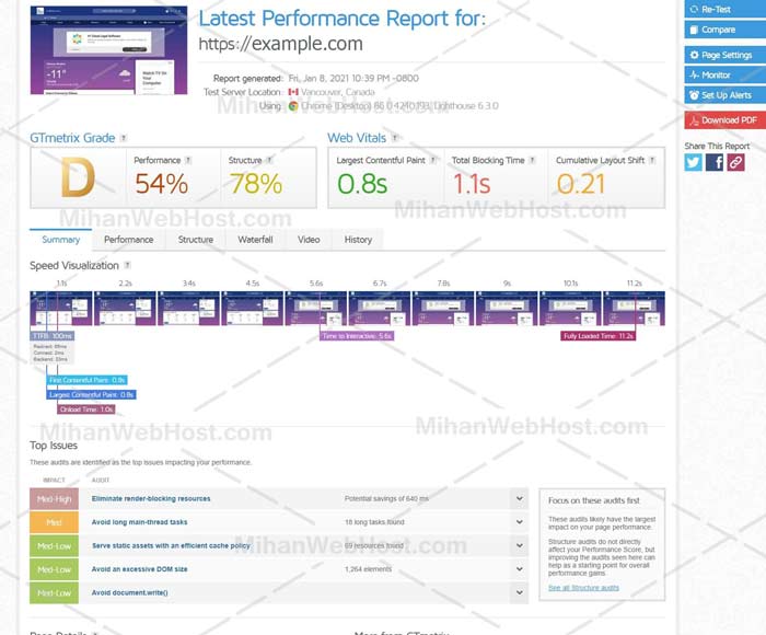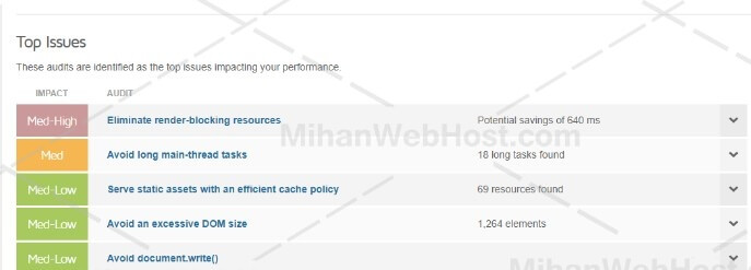 Summary اولین صفحه نتایج آنالیز است. همانطور که در تصویر فوق مشاهده می کنید، سایت مورد بررسی دارای رتبه D می باشد. در این تب خلاصه ای از نحوه لود سایت، اعم از پاسخگویی درخواست توسط سرور، اولین لود و در نهایت لود کامل نمایش داده می شود. در پایین همین صفحه و در بخش Top Issues (تصویر۴)، مشکلات اصلی ساختار سایت را مشاهده می کنید که بیشترین تأثیر را در عملکرد صفحه شما دارند. در این بخش به صورت خلاصه سرعت لود سایت براساس سه معیار جدید گوگل یعنی LCP – CLS و FID بررسی شده است.
