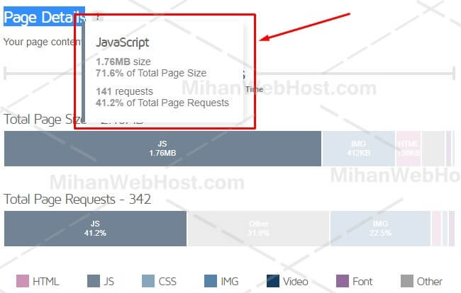 مورد بعدی که در تب Summary نمایش داده می شود، همانطور که در تصویر زیر مشاهده می کنید “Page Details” (تصویر۵) می باشد. در این بخش اطلاعات بسیار مهمی مربوط به تعداد درخواست های ارسالی سمت سرور و حجم فایل ها قابل مشاهده است. به هر مقدار تعداد درخواست های ارسالی سمت سرور و حجم فایل ها را کاهش دهید، سرعت لود سایت شما نیز بهبود می یابد.