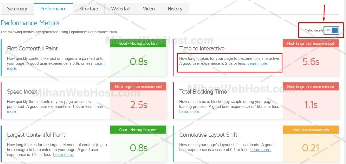 همانطور که در تصویر زیر مشاهده می کنید، هر معیار دارای یک توضیح مختصر است، که با کلیک روی “Metric details” و تغییر آن به “ON“، فعال می شود (بنابراین در یک نگاه می توانید معنای آن را متوجه شوید). بسته به نحوه عملکرد صفحه شما، معیار دارای رنگ بندی مختلف است.
